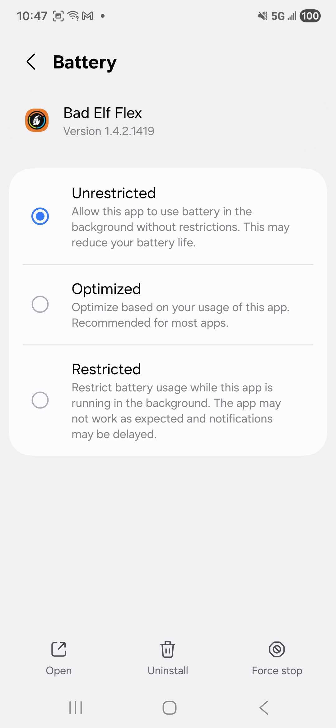 A: Android often suspends background processes to save battery. If the Bad Elf Flex app is set to "Optimized," the OS may kill the Bluetooth service when the screen is off, severing the link between the receiver and your GIS app.