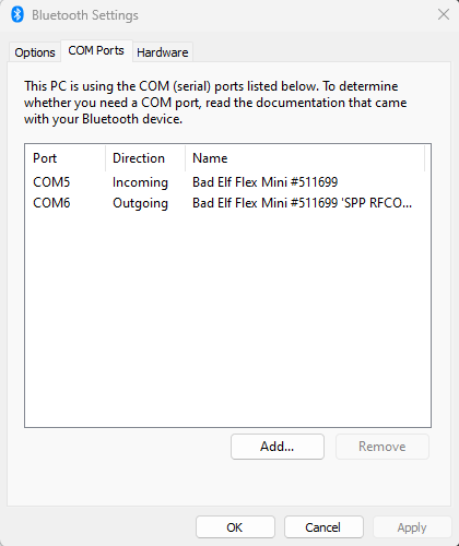 - Allow Windows to scan for Bluetooth devices. Your receiver appears as Bad Elf Flex or Bad Elf Flex Mini followed by the serial number