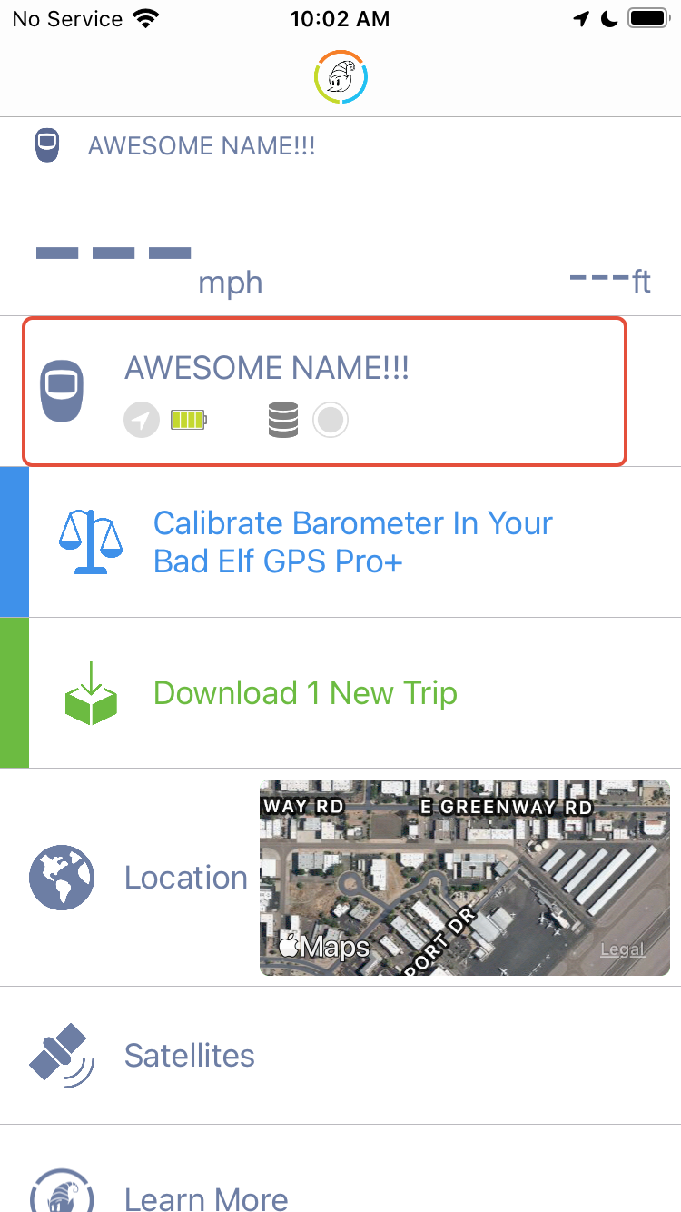 Open the Bad Elf GPS app and tap on the entry for your Bad Elf in the menu. At the top of the screen, you will see the Bad Elf default name in a text box. In this case, Bad Elf GPS Pro +