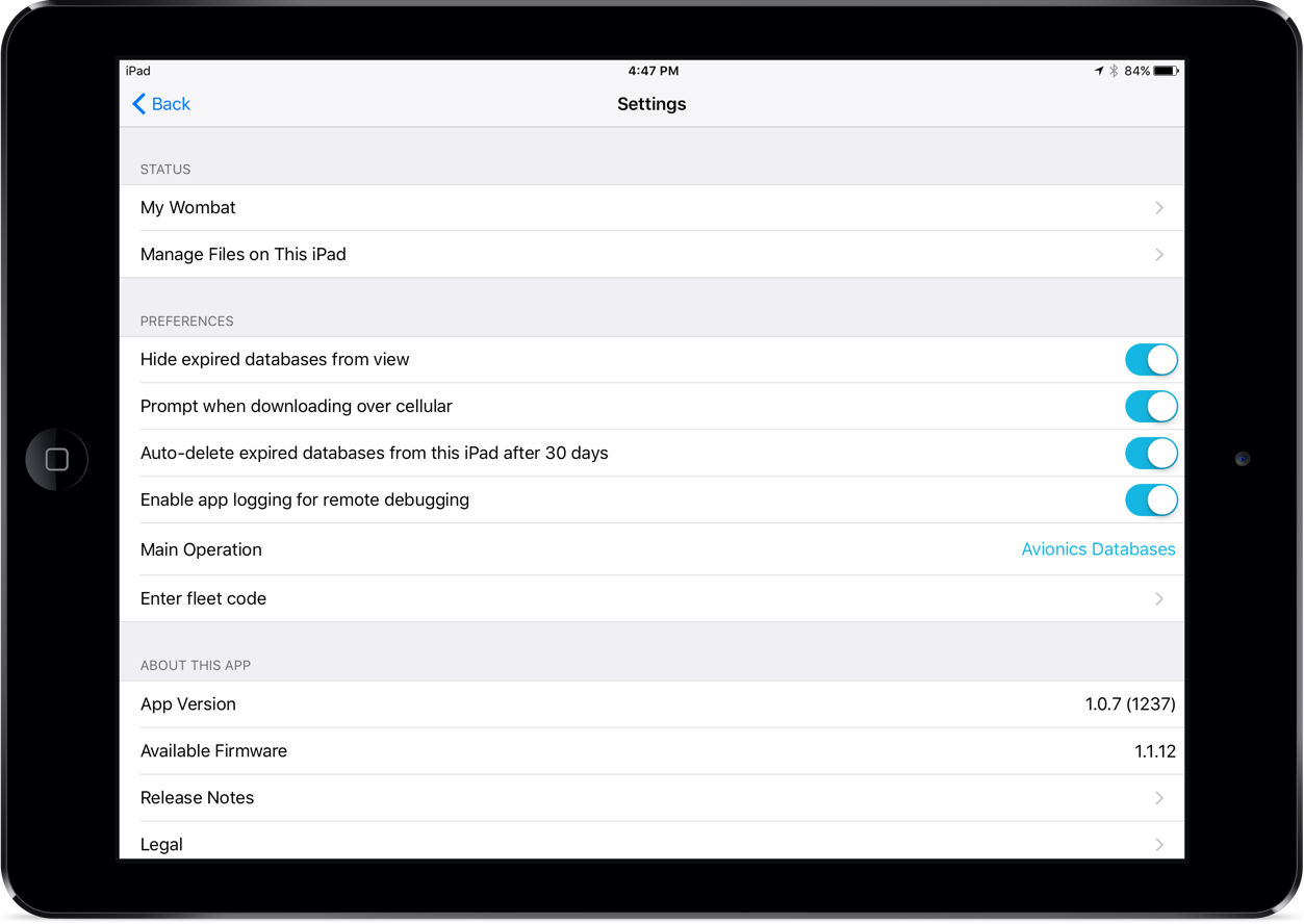 Welcome to the Settings page. For our purposes today, we're just going to be addressing the Main Operation tab under Preferences. Currently, my Wombat app is set to Flight Logs. Let's change that to Avionics Databases by tapping on Main Operation.