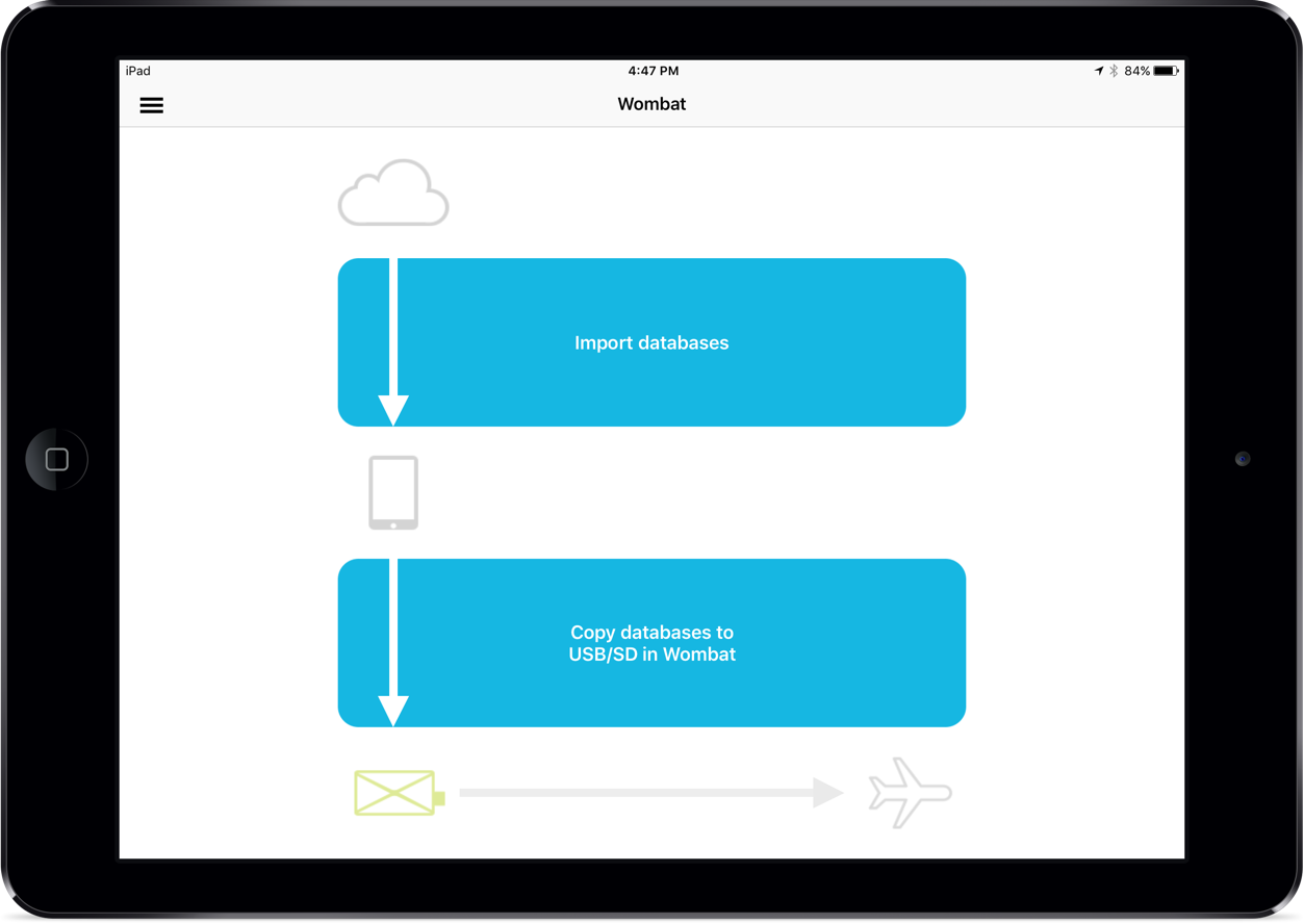 Before starting the following steps, which will show the process from within the Bad Elf Wombat App, take the relevant SD card or USB stick out of your panel, and insert it into the Wombat.